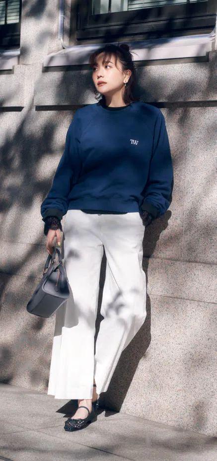 清爽干净的白牛仔裤为容易显保守的海蓝加入适度的休闲松弛感。袖口露出少许蕾丝花边,更添成熟甜美气质。